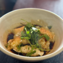 w/ prawn dumplings, spring asian greens, coriander and chilli. (Gluten Free)